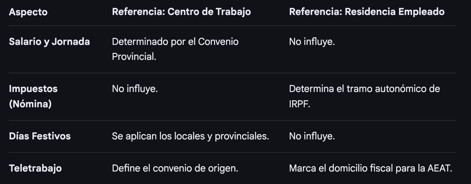 Retenciones de IRPF: El tramo autonómico del IRPF se aplica según la residencia habitual del empleado (donde pase más de 183 días al año). Por ejemplo, en 2026, las retenciones en tu nómina pueden variar si vives en Madrid o en la Comunidad Valenciana, independientemente de dónde esté la oficina. - Movilidad Geográfica: Si la empresa te traslada a un centro en otra provincia que te obligue a cambiar de residencia, se activan derechos legales de compensación por traslado o desplazamiento.